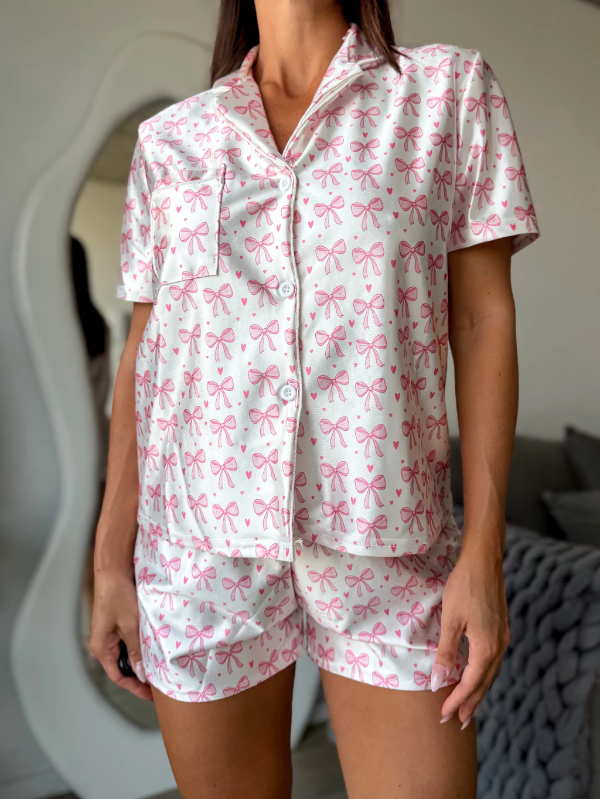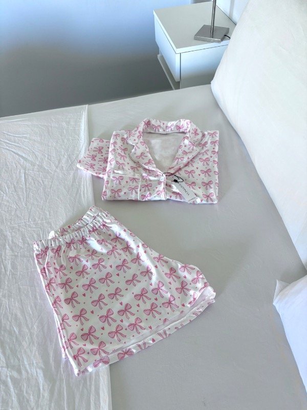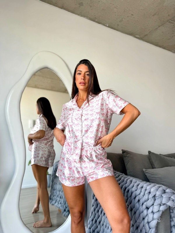 Conjunto de pijama corto de dos piezas, compuesto por camisa de manga corta con botones frontales y short con cintura elástica.