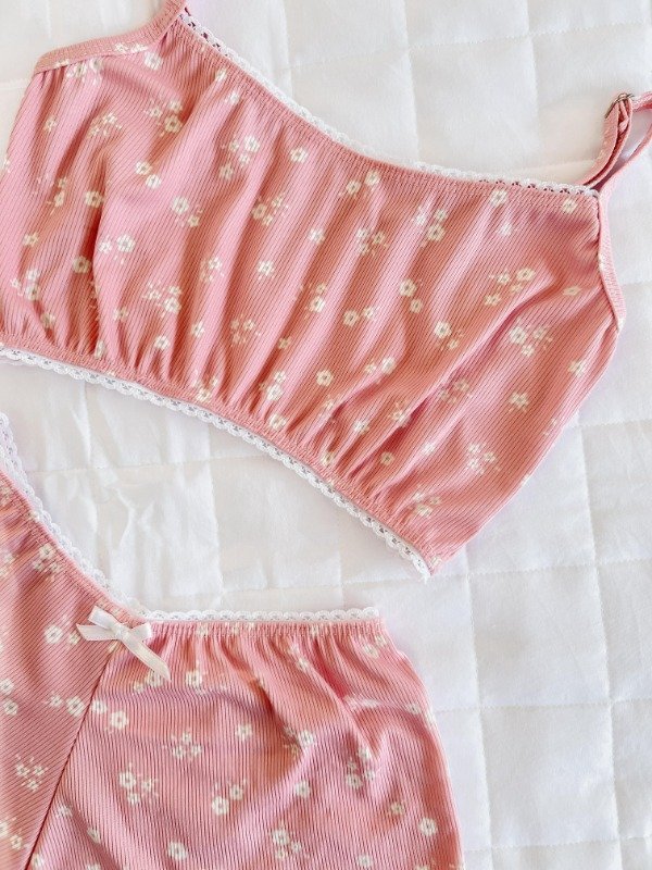 Pijamita de dos piezas confeccionado en morley acanalado , con top de breteles finos y culotte tipo shortcito de calce relajado.