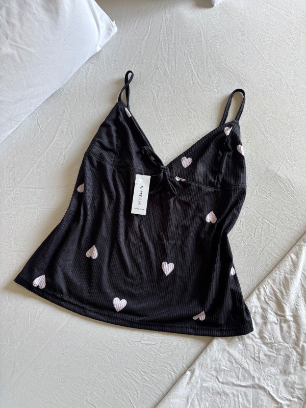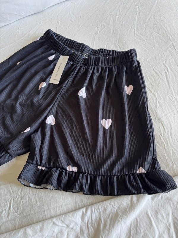 Top con breteles finos y short con elástico en la cintura y terminación en volados, confeccionado en morley suave y liviano. Estampa de corazones blancos sobre fondo oscuro, ideal para dormir cómoda y con estilo ☁️🖤
