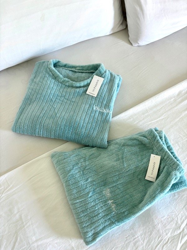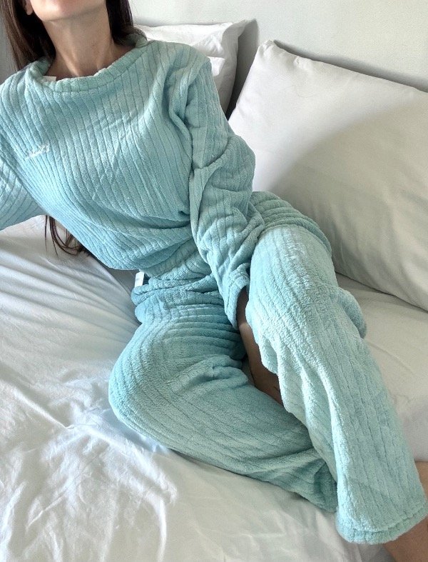 Nuestro pijama Soft Aqua está confeccionado en una tela plush ultra suave, ideal para mantenerte cómoda y calentita sin perder ese toque aesthetic que amamos.