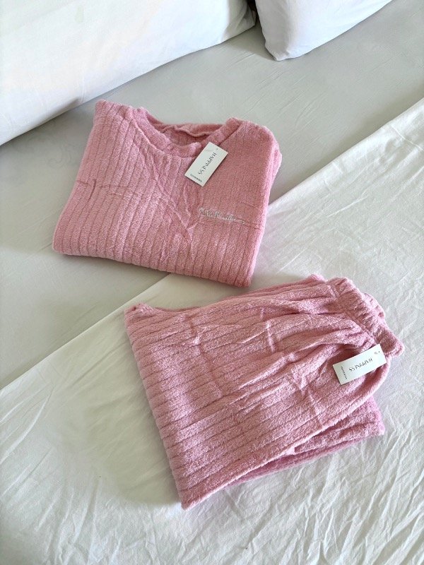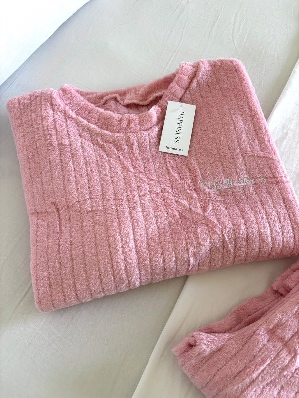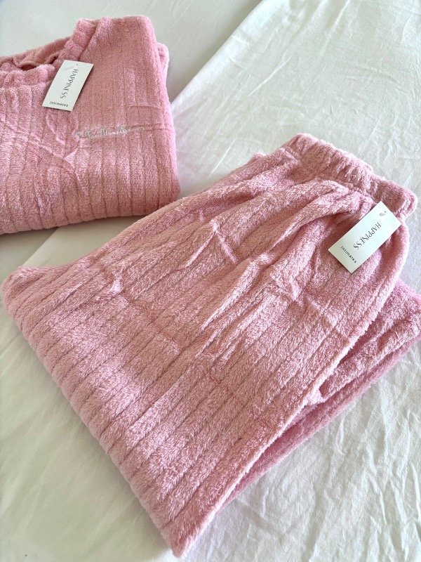 Nuestro pijama Soft rosa está confeccionado en una tela plush ultra suave, ideal para mantenerte cómoda y calentita sin perder ese toque aesthetic que amamos.