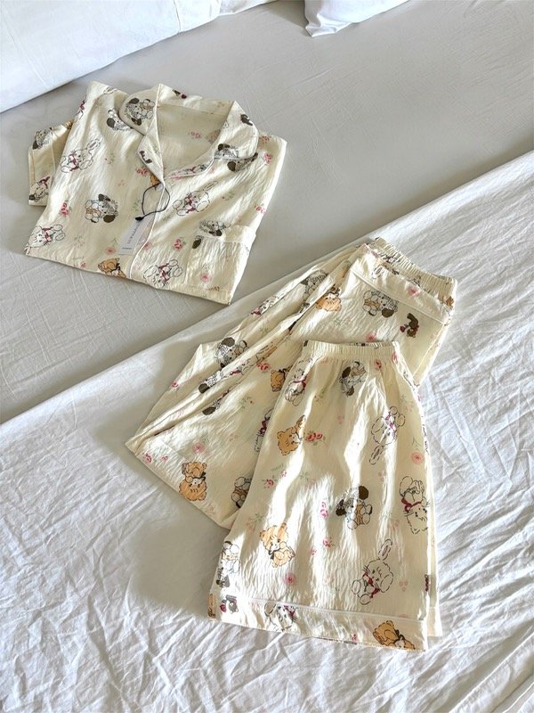 Camisa de mangas cortas con botones combinada con pantalón y short, ambos poseen elástico en la cintura de calce cómodo.