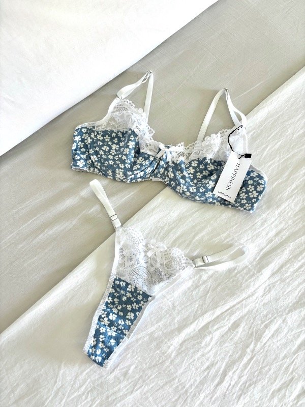 Conjunto de lencería delicado y femenino, confeccionado en algodón de morley con estampado de flores y detalles de puntilla.